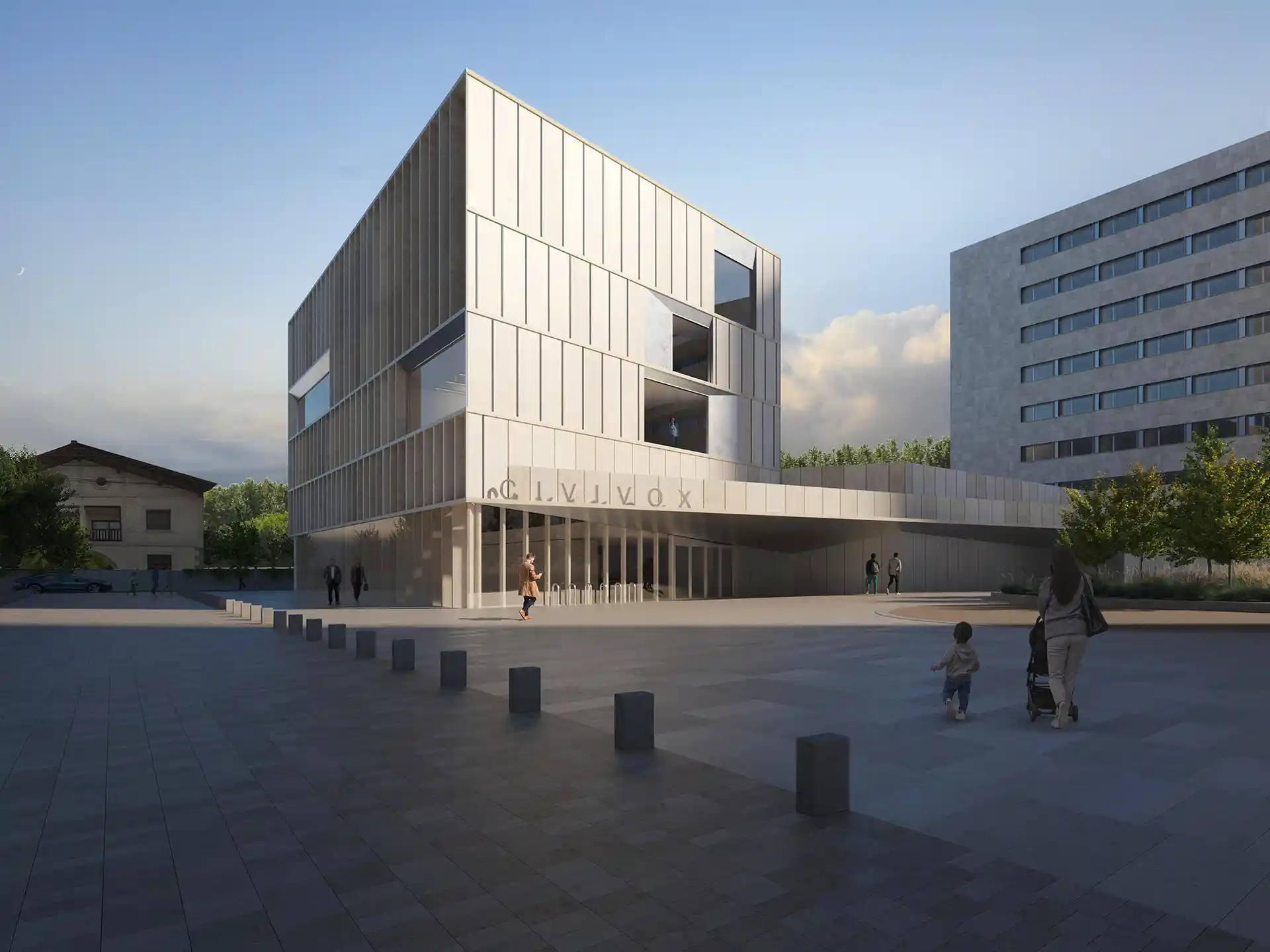 La fachada será de hormigón prefabricado, en el que se abrirán grandes ventanales, que se combinarán con celosías. Contará con un porche abierto a la plaza peatonal de Salesianos, un auditorio con capacidad para más de 400 personas, varias salas de exposiciones, para albergar muestras dedicadas al pintor Javier Ciga y al músico Pablo Sarasate, y aulas para la realización de diversas actividades. Será en la planta sótano, de 1.423 metros cuadrados, donde se ubique la zona expositiva. El salón de actos se construirá en la planta baja y podrá tener un funcionamiento independiente del resto del Civivox. El resto de espacios se repartirán en el resto de plantas.