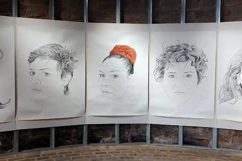 Ángela Moreno exhibe en el Horno de la Ciudadela diez retratos de gran tamaño de mujeres artistas, realizados a lápiz y grafito en papel reutilizado