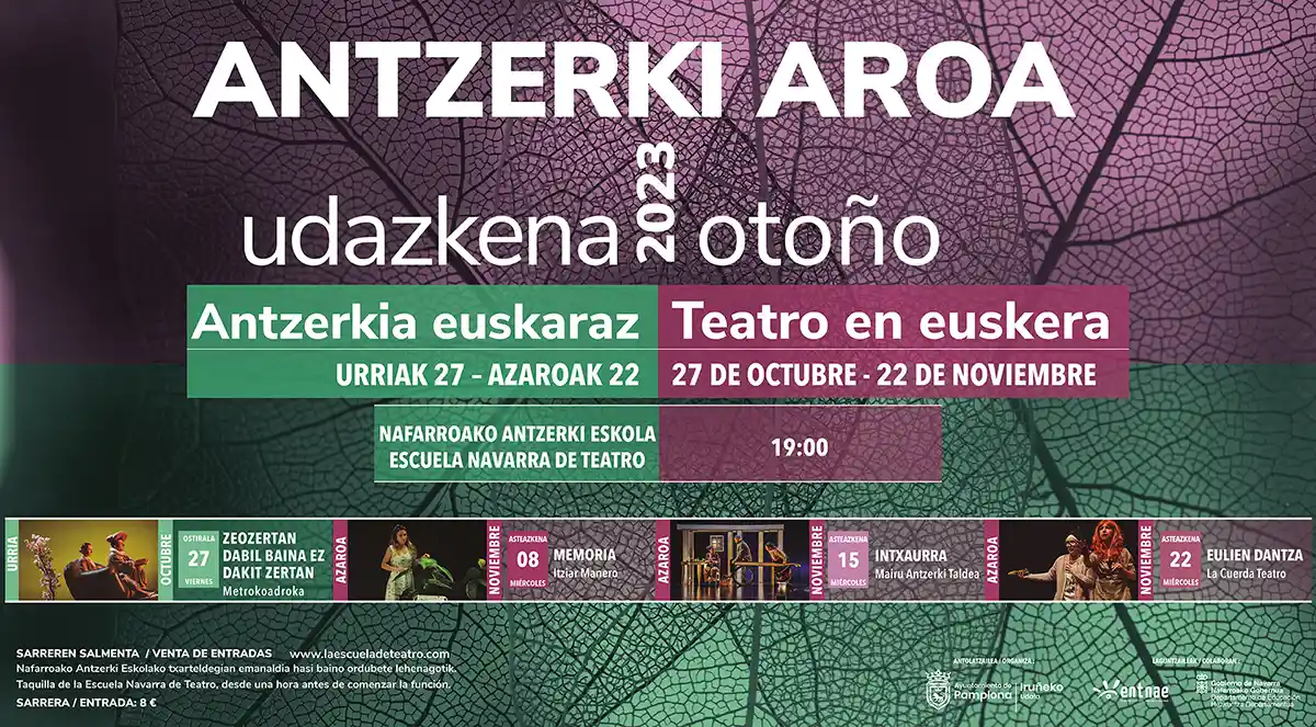 Cinco obras teatrales, del 25 de octubre al 22 de noviembre, conforman la edición de otoño de Antzerki Aroa, ciclo de teatro en euskera que organiza el Ayuntamiento de Pamplona. La Escuela Navarra de Teatro acogerá las cinco representaciones, todas ellas a las 19 horas. Este año como novedad, se realizará una primera función especial para presentar el ciclo, dirigida a estudiantes de euskera de centros de enseñanza para personas adultas, a las que se ha invitado previamente. Para las demás representaciones, las entradas se venden al precio de 8 euros en la web www.laescueladeteatro.com y en la taquilla de la Escuela Navarra de Teatro, desde una hora antes de comenzar la función.