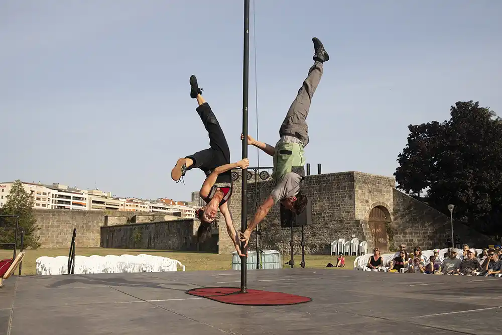 El ciclo Cinco Puntas de la Ciudadela inicia mañana martes 19 de agosto (20 horas) su tercera y última semana y lo hace con Ardatzak’ (ejes), una obra de Zirkozaurre premio al Mejor espectáculo de Euskadi, cuyo proceso creativo se pudo ver el año pasado en Atardecer Pamplona. El miércoles 20, con un cambio sobre el horario habitual (21 horas), toma el relevo una compañía navarra, La Banda teatro circo con ‘Yûgen’, un espectáculo presentado en diversos festivales nacionales e internacionales y el cierre de este ciclo en 2025 lo hará ‘Faltan7’, un espectáculo familiar de la compañía ‘Sin Solo’ (20 horas).
