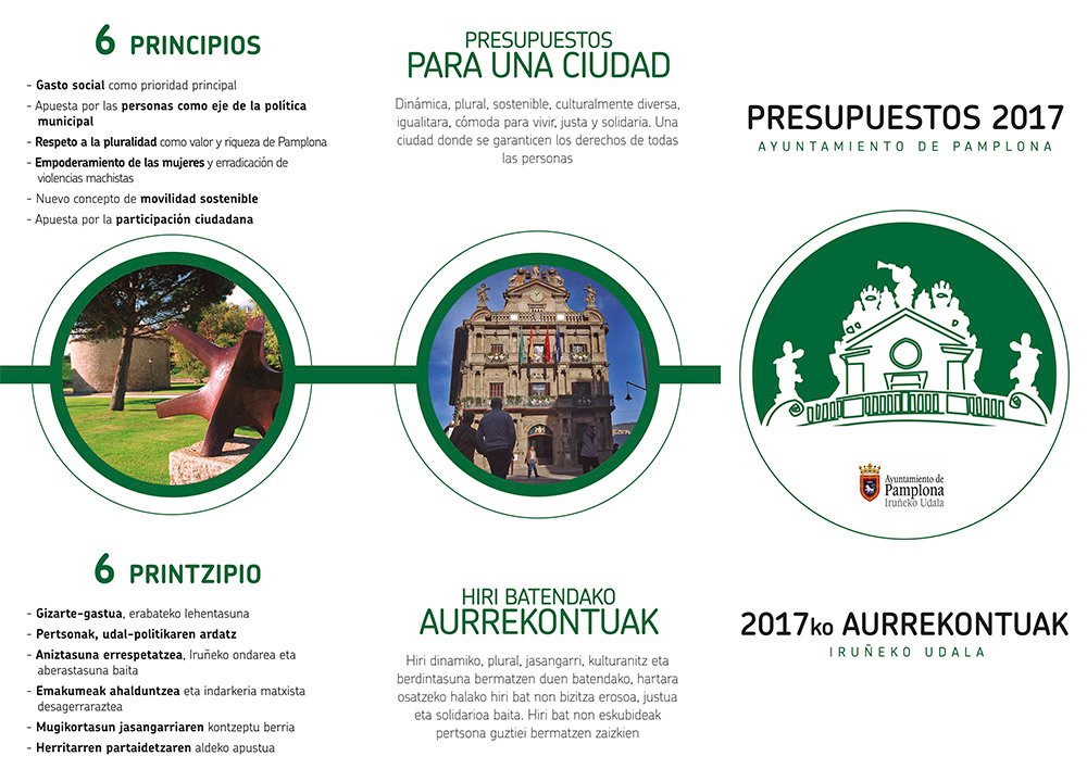 El tríptico recoge los seis principios por los que se guían los presupuestos de Pamplona para 2017: el gasto social como prioridad principal; la apuesta por las personas como eje de la política municipal; el respeto a la pluralidad como valor y riqueza de Pamplona; el empoderamiento de las mujeres y erradicación de violencias machistas; el nuevo concepto de movilidad sostenible; y la apuesta por la participación ciudadana.
