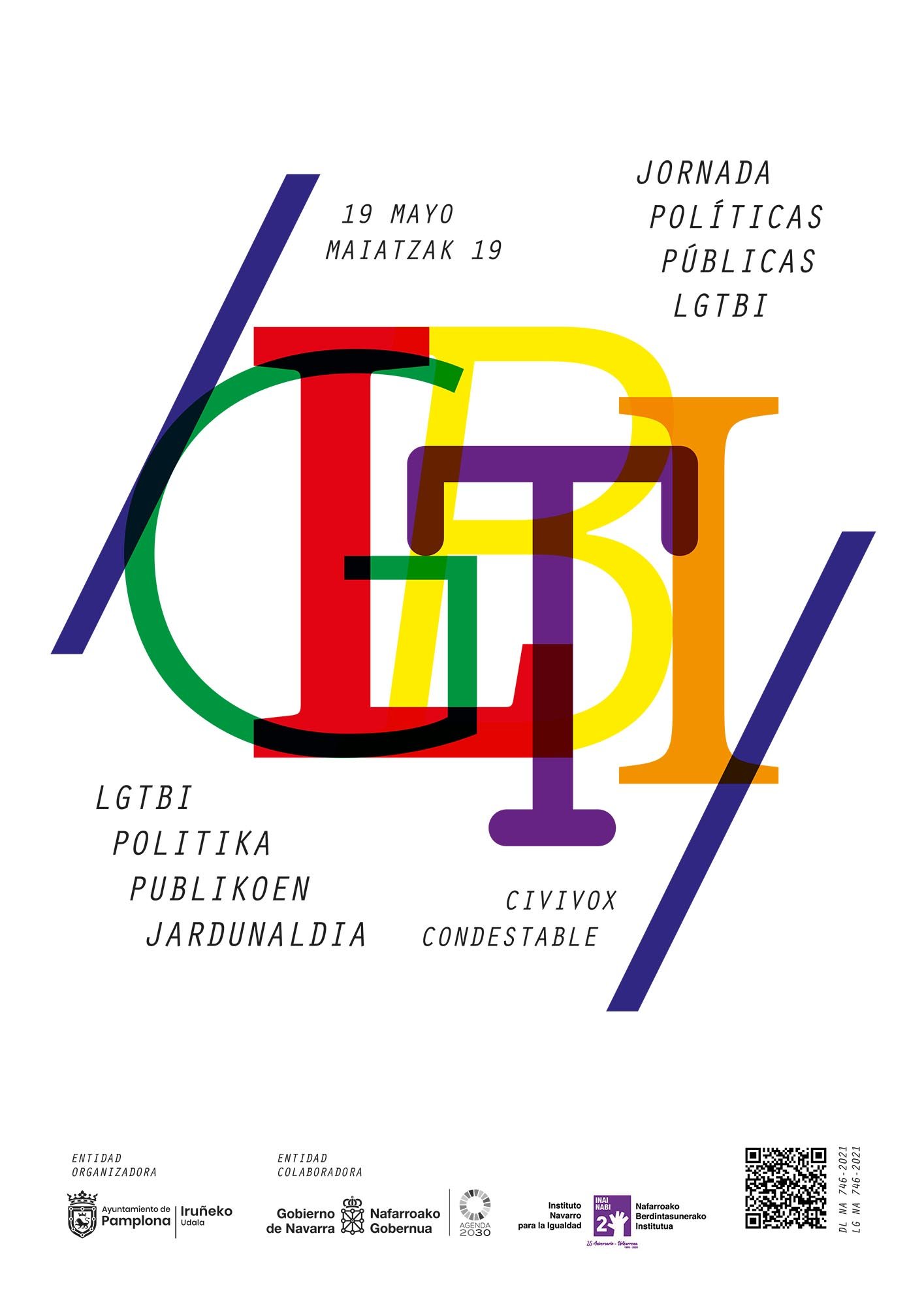 La jornada ‘Políticas Públicas LGTBI’ comenzarán a las 9.30 horas y se extenderá hasta las 18,15 horas. Contarán con 5 intervenciones de ponentes especialistas: Abel Huete, activista queer y trabajador social; Francisco Peña Díaz de la Asociación Internacional de Lesbianas, Gays, Bisexuales, Trans e Intersex (ILGA); Vanesa Eguíluz González, ex sub-directora de Igualdad LGTBI+ en el Instituto Navarro para la Igualdad; Marta Castillo Charfolet, de la Fundación Tomillo y Xabier Sánchez Goronaeta y Eva Leoz Muruzábal de la Consultora Zeharka.