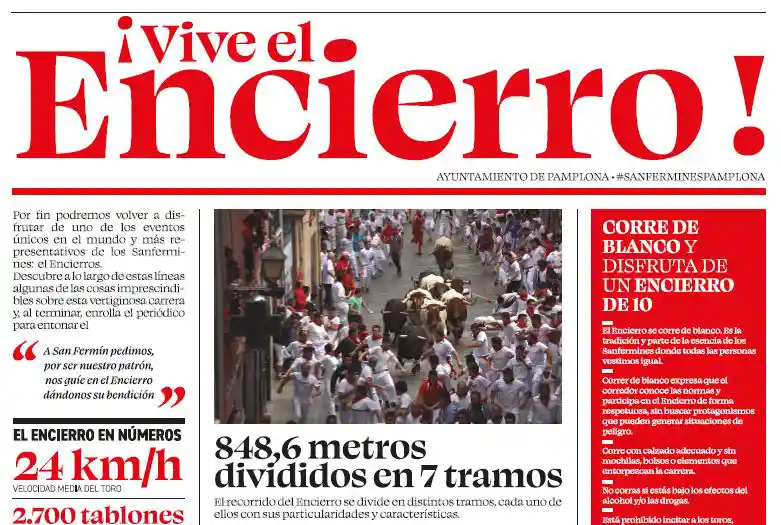 El periódico recoge el cántico al santo, que se puede escuchar tres veces cada mañana del 7 al 14 de julio, así como una descripción de los 848,6 metros del recorrido, divididos en siete tramos: cuesta de Santo Domingo, Plaza Consistorial / Mercaderes, Curva de Mercaderes, Estafeta, Curva de Telefónica, Callejón y Plaza de Toros. Correr de blanco, respetar las normas, correr con calzado adecuado, no grabar mientras se corre, no citar ni llamar la atención de los toros o no participar si se está bajo los efectos de drogas o alcohol son algunos consejos para disfrutar de un encierro ‘de 10’. Por último, a través de un QR, se pueden visualizar todos los encierros de San Fermín desde 2015.