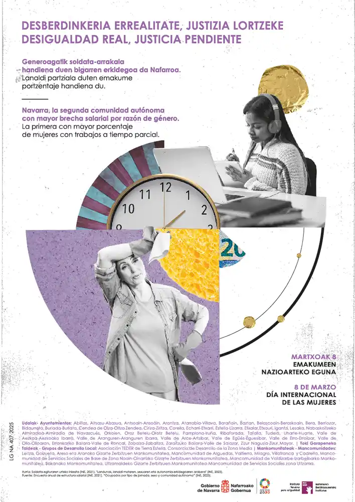 Que la igualdad de género es una cuestión de justicia social que continúa estando pendiente está avalado por las estadísticas. En Navarra las mujeres ganan un 20% menos que los hombres y únicamente representan el 36% en puestos de liderazgo. Más del 80% de los empleos a tiempo parcial en 2020 estaban ocupados por ellas y, además, el 87% de quienes afirman que sus obligaciones familiares condicionan su jornada laboral, son mujeres.