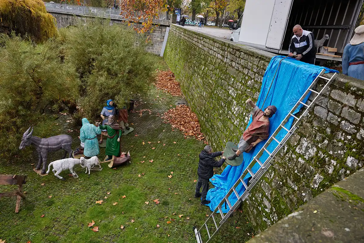 El Ayuntamiento ha comenzado a montar hoy el belén de gran tamaño que preside la Navidad pamplonesa desde los fosos de la Taconera