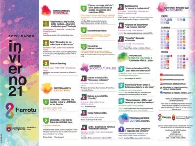 La programación de actividades del centro Harrotu para este invierno se compone de una veintena de diversas actividades que, a través de talleres, encuentros, conferencias o el acercamiento a obras literarias, trabajarán para sensibilizar y formar a la ciudadanía en la realidad LGTBI+. La jornada mundial contra la LGTBIfobia en los deportes, o el día de la visibilidad trans, serán junto con otros temas como la educación, el ciberacoso en redes, el amor o las masculinidades los ejes temáticos de la programación de este trimestre.