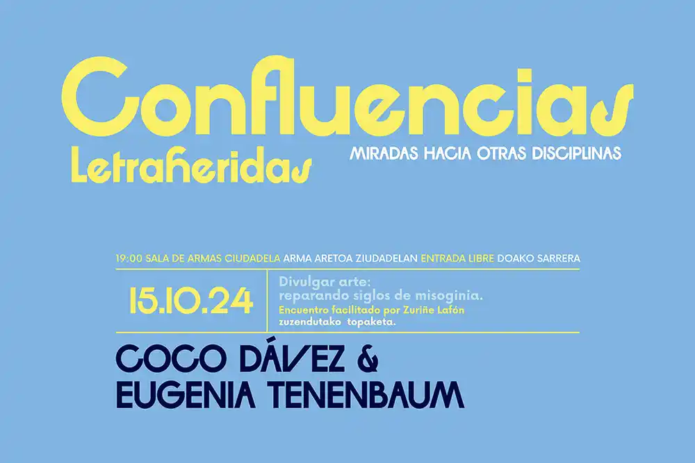 La Sala de Armas acoge este martes, a las 19 horas, el segundo encuentro del ciclo ‘Confluencias: miradas hacia otras disciplinas’, centrado en el arte. Con el título ‘Divulgar arte: reparando siglos de misoginia’, la artista multidisciplinar Valeria Palmeiro, más conocida como Coco Dávez, y la historiadora del arte especializada en perspectiva de género y crítica de arte Eugenia Tenenbaum dialogarán, moderadas por Zuriñe Lafón, investigadora y docente universitaria sobre Cultura Visual.