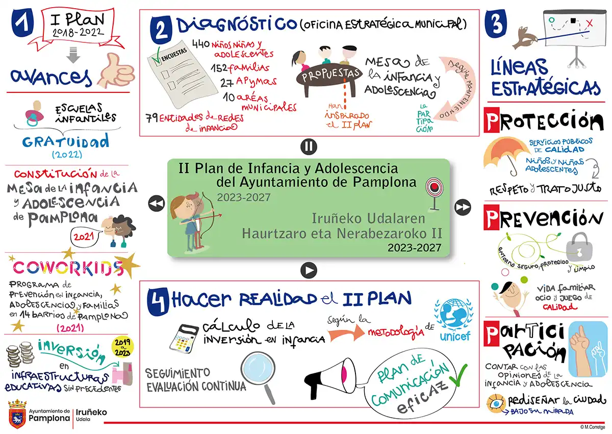 En 2018, el Ayuntamiento de Pamplona aprobó el I Plan Municipal de Infancia y Adolescencia para los años 2018-2022, en el que se recogía la política municipal en pro de la infancia y adolescencia, articulando mecanismos de participación. Este plan sirvió de marco para la obtención de la acreditación de Pamplona como Ciudad Amiga de la Infancia. Tras la evaluación del I plan tanto interna como de UNICEF, se inició el proceso de elaboración del segundo plan.