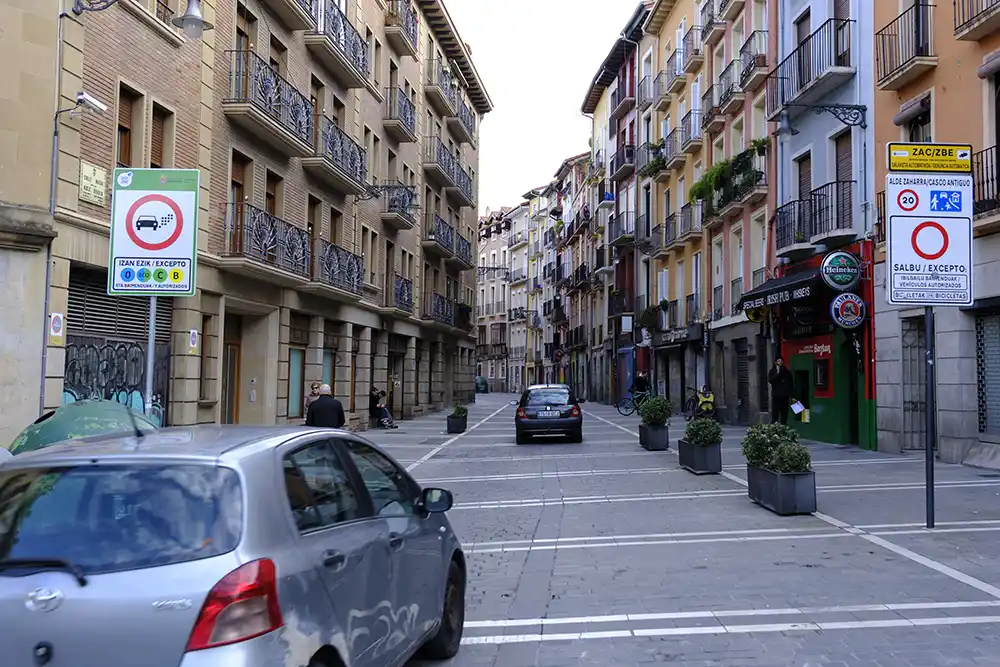 El acceso a la ZBE está sometido a la clasificación medioambiental de la Dirección General de Tráfico, de forma que solo pueden circular dentro los vehículos con las etiquetas 0, Eco, B y C, además de los vehículos autorizados. Los residentes del Sector 1 (Casco Antiguo) o del paseo de Sarasate (dentro del Sector 2) no precisan el distintivo, ni tampoco los vehículos de personas con movilidad reducida o dependientes, los titulares de plazas de garaje o que vayan a aparcar en un aparcamiento público, los titulares de establecimientos comerciales y hoteleros, los vehículos de emergencia, de obras, mudanzas o reparaciones y el transporte público.