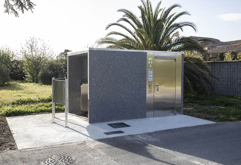 El aseo, fabricado en hormigón armado con revestimiento de materiales de fácil limpieza, consta de una cabina-aseo y dos urinarios exteriores, que cuentan con un separado vertical. En el interior, el espacio dispone de calefacción regulable por termostato, sistema de ventilación forzada y puerta de acceso de acero inoxidable, con cierre automático por detección de presencia mediante electroimán. Para saber si está libre u ocupado, el habitáculo incluye un indicador exterior de situación de uso (libre, ocupado, fuera de servicio) y un sistema limitador de estancia en el interior de la cabina. Tras cada utilización, se activa un sistema de autolimpiado, desinfección y secado automático que incluye el asiento y la tapa del inodoro. Con el objetivo de hacerlo accesible para personas con discapacidad, el aseo cuenta con barras de apoyo y el lavamanos también está adaptado.