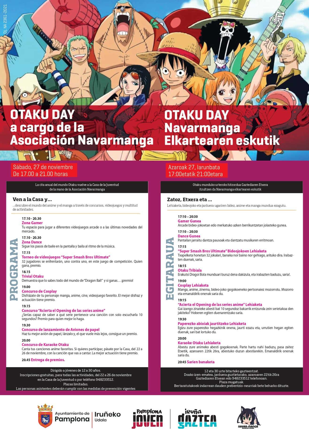 En esta edición los concursos tendrán premios de entre 20 y 50 euros en tarjetas de regalo salvo el Concurso de lanzamiento de aviones de papel cuyo premio es una serie de anime en Blu-Ray. La entrega de galardones será el último acto de la jornada. Todas las propuestas para el Otaku Day tendrán entrada libre, previa inscripción presencial en la Casa de la Juventud, hasta el 26 de noviembre, o por teléfono en el número 948 233 512. Las actividades estarán abiertas a jóvenes de 12 a 30 años y todas las personas asistentes deberán cumplir con las medidas de prevención sanitaria vigentes frente a la COVID-19.
