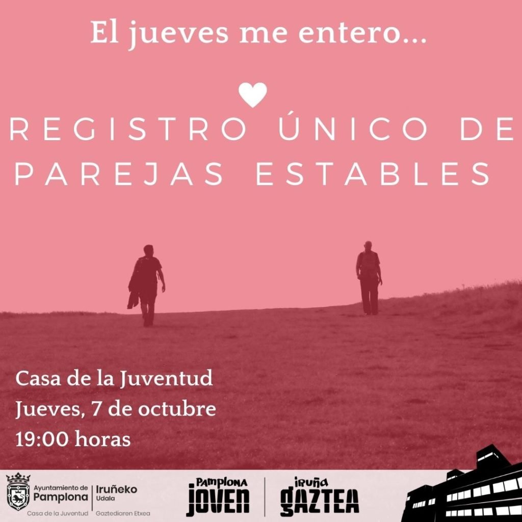 En esta ocasión, la Asesoría Jurídica tratará sobre la regulación de las parejas de hecho en Navarra, debido a que ha sufrido diversas modificaciones a lo largo del tiempo. La última de ellas ha sido la creación de un Registro Único de Parejas Estables, para toda la Comunidad Foral, que viene a suplir los registros municipales. Con la Reglamentación en vigor desde mayo, en esta sesión se conocerá el modo de acceso, los beneficios y los derechos que otorga la inscripción en el mismo.