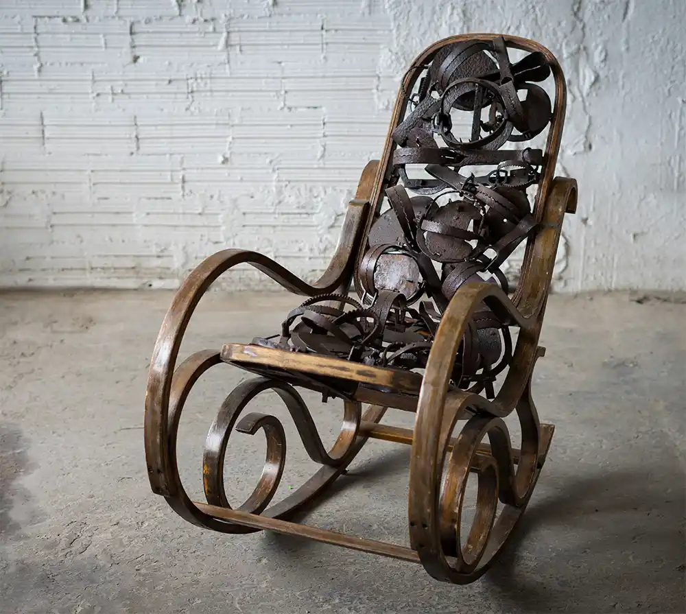 Las mecedoras que se exponen propenden al sesteo, al sopor y al sueño frágil. En esos sueños urgentes que provoca la digestión tienden a colarse pesadillas. La serie de mecedoras la fue creando Erretan en torno al inicio de la guerra de Ucrania, con lo que de ella se puede sacar la simbología de lo tenue que es el hilo que separa la placidez del horror: el descanso de sentarse en una mecedora frente al hilo de hierro, al hilo de alambre con púas que retuerce de dolor en sangrante metonimia.