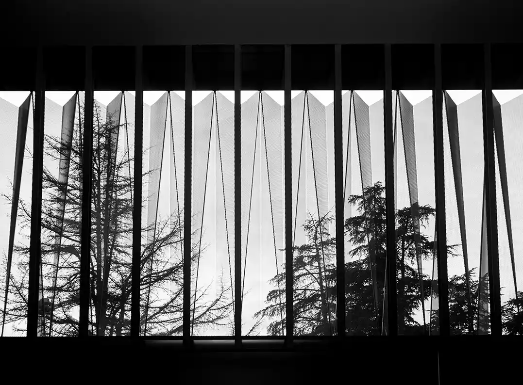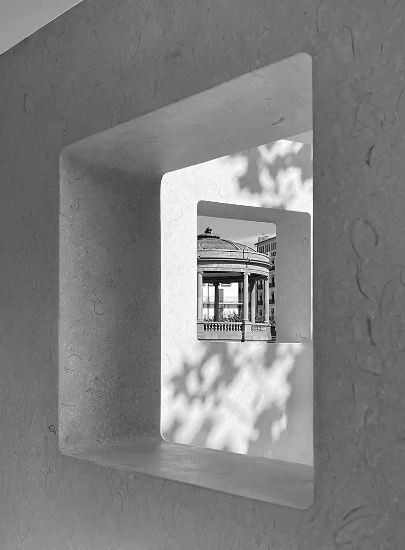 | Título y descripción de la fotografía. | Al otro lado. Es una imagen del edificio de investigación biomédica, hacia fuera y a través de sus elementos arquitectónicos. |
