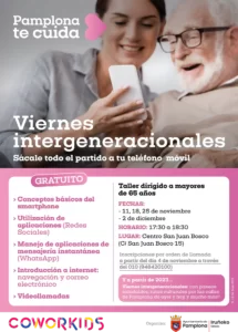 Los ‘Viernes intergeneracionales’ son un nuevo programa del Ayuntamiento, dentro de la estrategia ‘Pamplona te cuida’, en el que jóvenes estudiantes formarán y ayudarán a mayores de 65 años en el uso de las nuevas tecnologías. En noviembre y diciembre, en cuatro sesiones, se enseñará en el Centro San Juan Bosco a sacarle todo el partido al teléfono móvil, uso de aplicaciones, redes sociales, Whatsapp, navegación por internet o videollamadas.