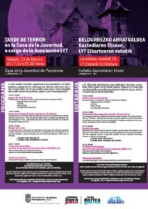 La Casa de la Juventud propone para este sábado una nueva tarde de ocio dedicada al terror. De 17.15 a 21 horas se sucederán los juegos de rol, los juegos de mesa, los escape room y las proyecciones cinematográficas, aderezadas con un photocall temático. Todas las actividades son gratuitas y tienen la entrada libre, previa inscripción en la propia Casa de la Juventud o en el teléfono 948 23 35 12. Esta tarde de terror está dirigida a jóvenes entre 14 y 30 años.