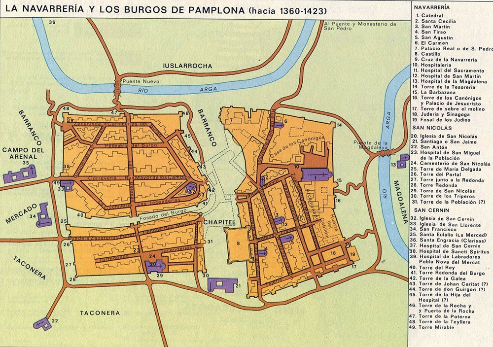 Repasará también la ponente los sistemas de organización vecinal en aquellos tiempos y la existencia de un pequeño barrio, ahora desaparecido, llamado de San Miguel, que no era el único del que se tienen noticia por la zona. Hablar de la Navarrería es, también, hablar de los enfrentamientos intramuros y de los sistemas pre-modernos de fortificación. Así, los asistentes a la charla podrán hacerse a la idea de forma más concreta de los dos castillos que albergó la ciudad antes de la construcción de la Ciudadela: el castillo de Luis el Hutín (s. XIV) –del que ahora se han encontrado vestigios que permiten una localización más concreta, una fortificación fue destruida para construir el Castillo de Santiago (s. XVI), de la época de Fernando el Católico, que se encontraba en el arranque de la avenida Carlos III.