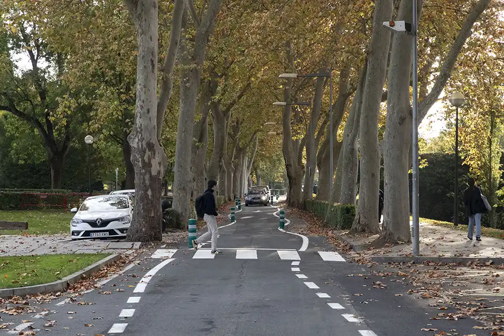 Entre las técnicas de urbanismo táctico utilizadas se encuentra la señalización tipo zig-zag, una medida reductora de la velocidad que modifica la alineación de la zona de circulación, haciéndola pasar de rectilínea a curvilínea. Con este tipo de señalización del firme, se ha reducido la anchura de 5,5 metros a 2,85 metros, y se ha generado una percepción de estrechez de la vía que consigue que los vehículos que circulan tengan que recudir la velocidad.