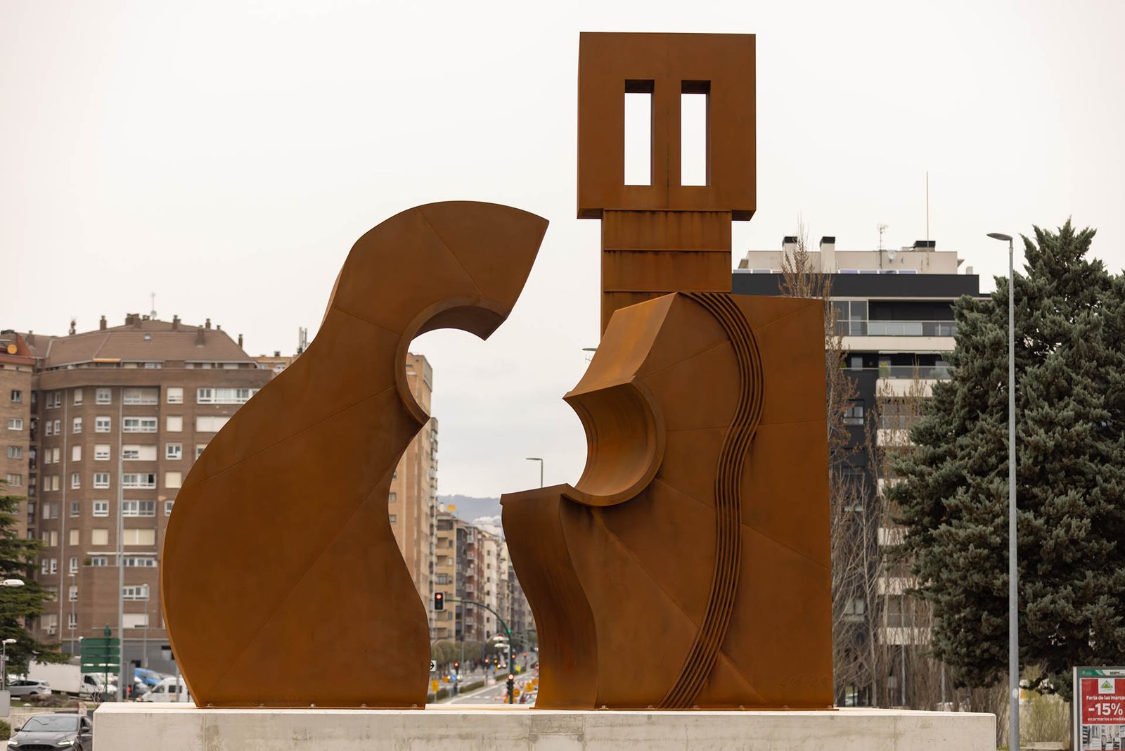 El conjunto monumental representa una guitarra deconstruida en tres grandes piezas de acero cortén, con una altura máxima de 8 metros y una anchura máxima de 9 metros. Las piezas están ancladas desde una base de hormigón y una de las virtualidades del proyecto es que los volúmenes de perciben de forma diferente desde los cuatro sentidos de tráfico que gestiona la rotonda. Carlos Ciriza, su autor, es un artista consagrado que ha realizado alrededor de 130 obras escultóricas de gran formato para el espacio público a lo largo de todo el mundo. Esta obra pasará a formar parte del Patrimonio Cultural y Artístico de la ciudad.