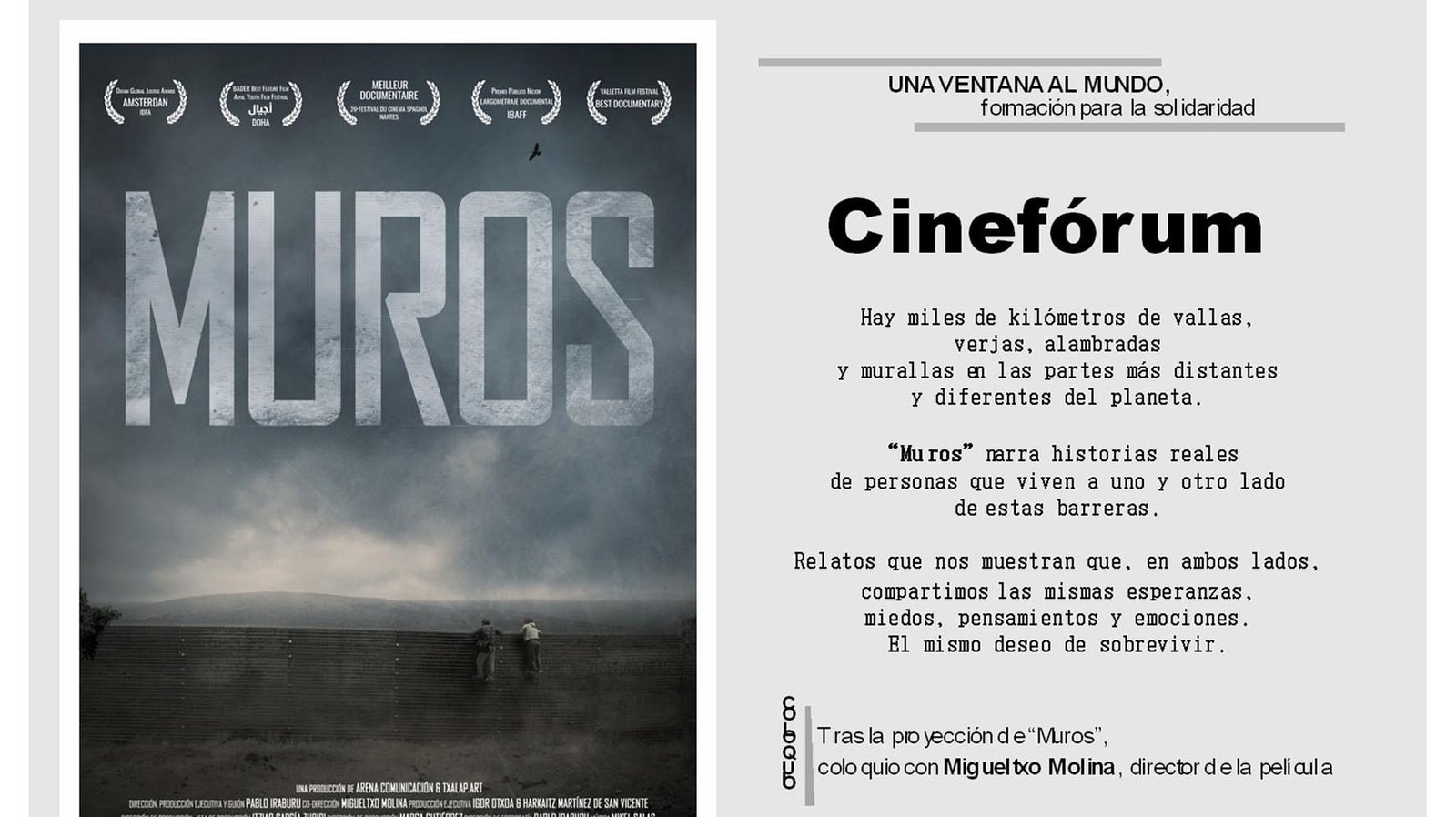 La Casa de la Juventud acogerá mañana, jueves 28, una proyección coloquio sobre el documental ‘Muros’ (España, 2015, 83’), de los directores Pablo Iraburu y Migueltxo Molina. El documental recoge historias reales de personas que viven a ambos lados de muy distintos muros de separación de diferentes países del mundo. Es el muro el que divide a comunidades y personas que en realidad tienen mucho en común, como sus sueños y esperanzas básicos. Dice la voz en off del tráiler “No va a parar el movimiento, la gente nace para desplazarse; todos somos seres humanos, todos venimos del algún lugar”.