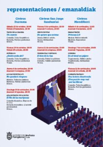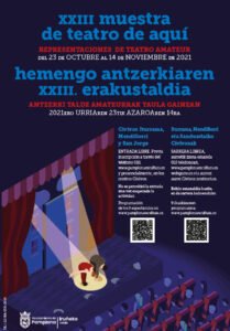 El próximo sábado, 23 de octubre, comienza la XXIII Muestra de Teatro de Aquí que va a ofrecer 9 representaciones de grupos aficionados hasta el 14 de noviembre en tres centros de la red Civivox: Iturrama, Mendillorri y San Jorge. La información completa de cada uno de los grupos y los argumentos de las obras está disponible en la página web municipal de Cultura.
