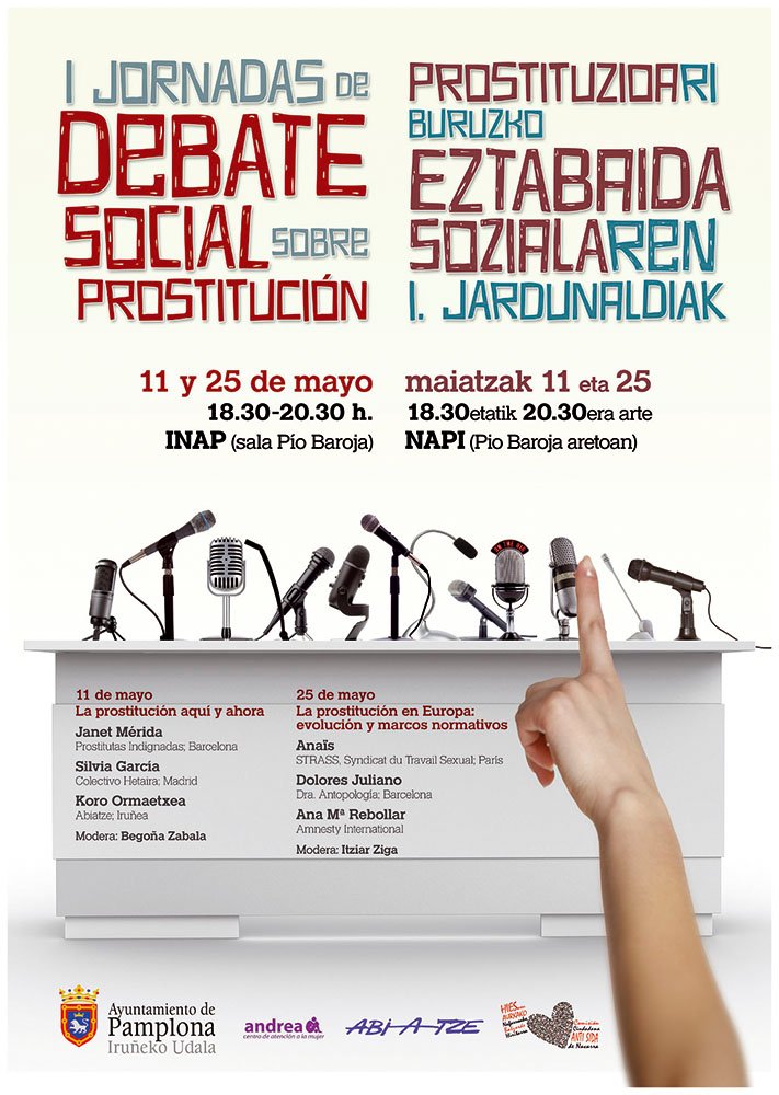 El Ayuntamiento de Pamplona en colaboración con los colectivos sociales Abaiatze, Andrea y Comisión Ciudadana Anti-Sida ha organizado las I Jornadas de Debate Social sobre Prostitución que se van a celebrar los días 11 y 25 de mayo en el Instituto Navarra de la Administración Pública (INAP) con la participación de personas expertas de ámbito nacional e internacional. El Área de Empoderamiento Social, Igualdad y Participación Ciudadana ha impulsado esta actividad teniendo en cuenta los compromisos de ejecución del III Plan de Igualdad de Pamplona, y centrándose, en concreto, en los ámbitos correspondientes a ‘Empoderamiento de las mujeres y cambio de valores’ y ‘Una vida libre de violencia contra las mujeres en una ciudad segura’.
