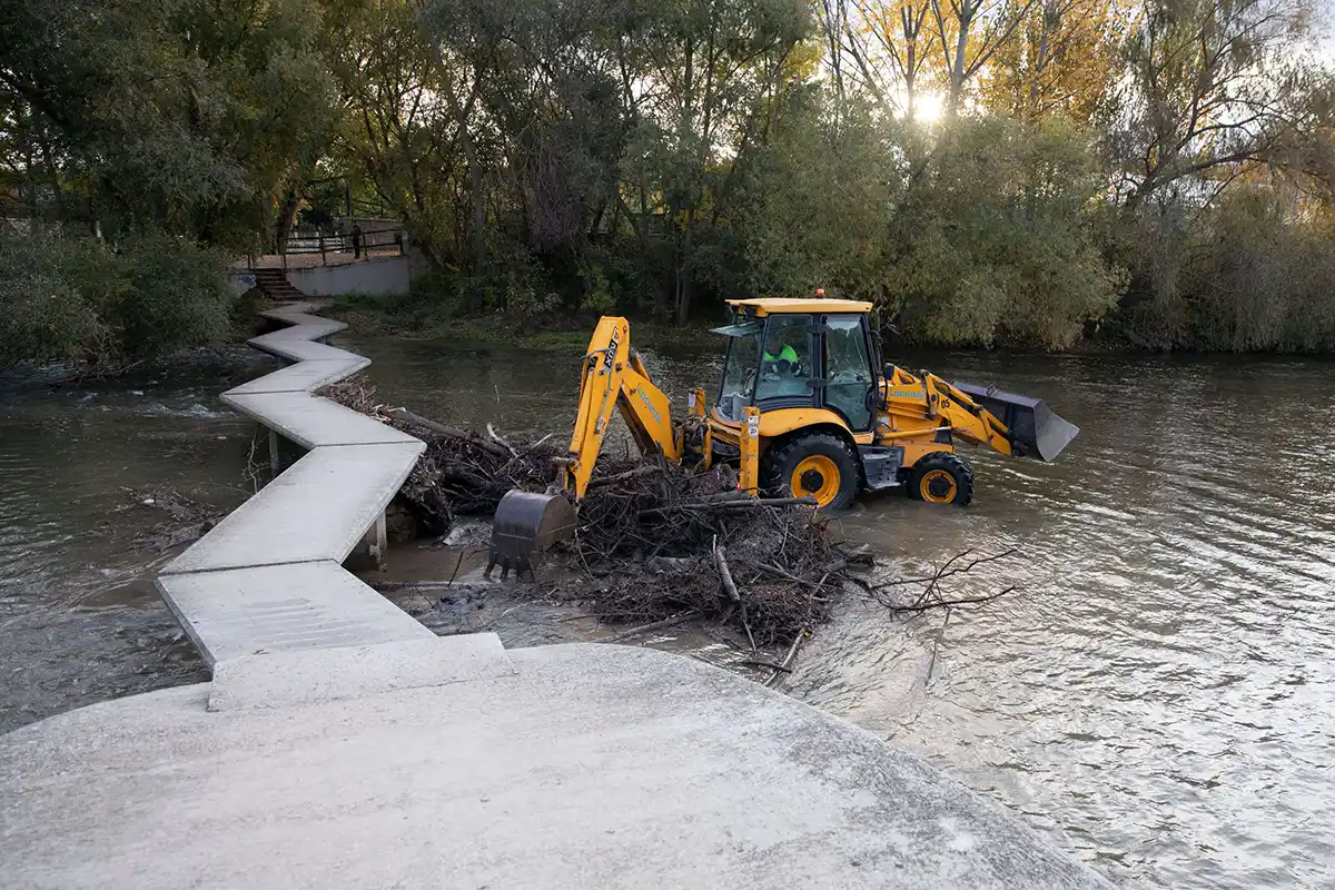 Esta limpieza, realizada estos días, busca preparar la zona de las pasarelas del río ante la época con mayor probabilidad de lluvias. En este sentido, se trata de una acción preventiva, ya que en la actualidad no existe riesgo para la ciudadanía a la hora de cruzar las pasarelas. Al tratarse de una actuación de dificultad media, se realiza cuando el caudal del río no es alto. De hecho, el caudal señalado como máximo para realizar una actuación de limpieza de este tipo, unido al nivel que alcance, es de 10 m3/s. Para realizar los trabajos, se ha hecho uso de una retroexcavadora, que ayuda en el desatrapado y retirada de los troncos y ramas de mayor tamaño. Para ello, la máquina se adentra en el cauce, ayudada del cazo o de una eslinga, saca la vegetación hasta la orilla. Además, cuatro trabajadores municipales realizan labores manuales para trocear y cargar el transporte para enviar los restos hasta el vertedero.