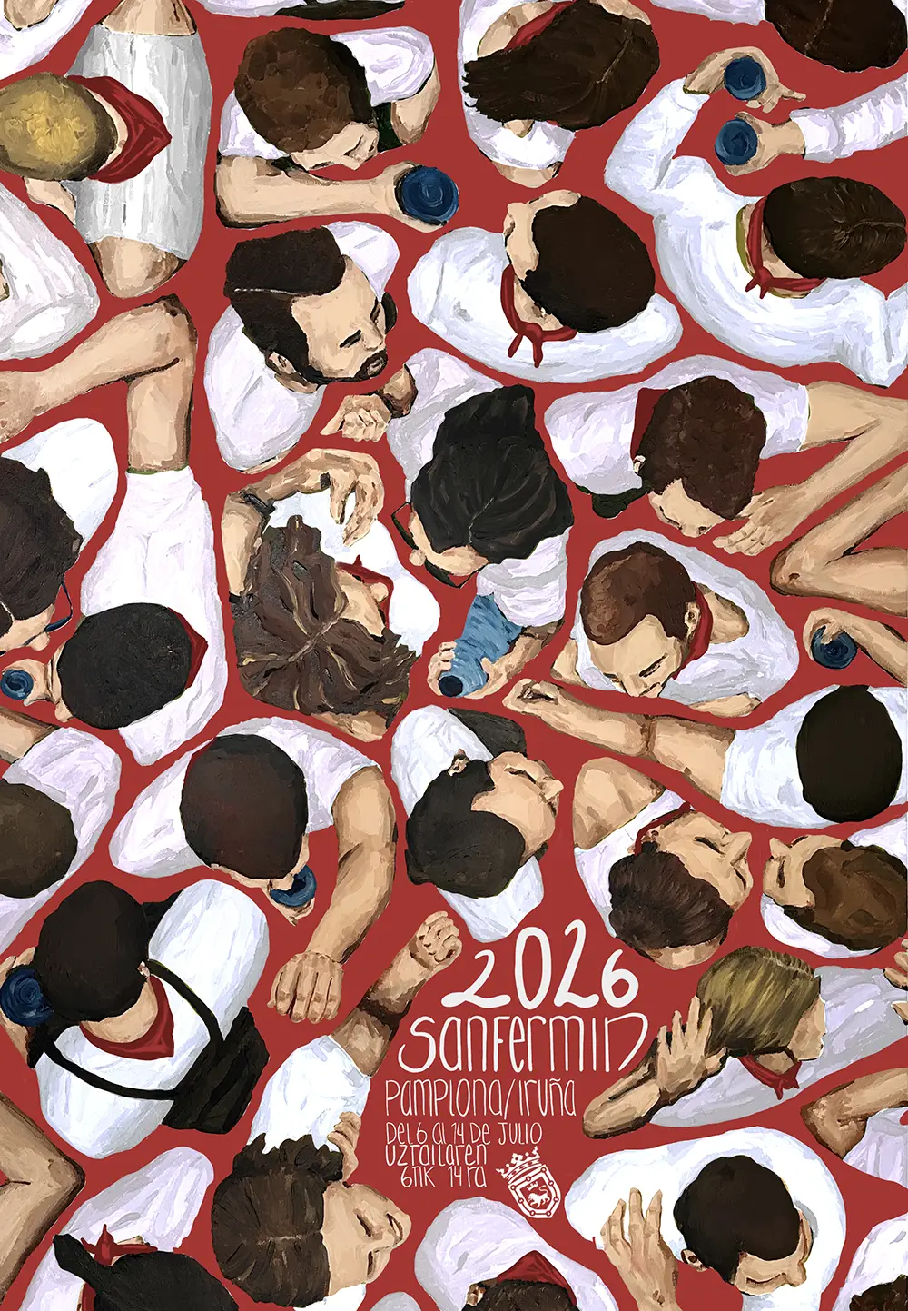 - El cartel consigue transmitir con acierto la esencia de los Sanfermines, reflejando la riqueza de momentos, tradiciones y vivencias que conforman las fiestas. Destaca por su gran actividad y dinamismo, con una composición muy viva y llena de escenas que evocan el carácter colectivo y participativo.
