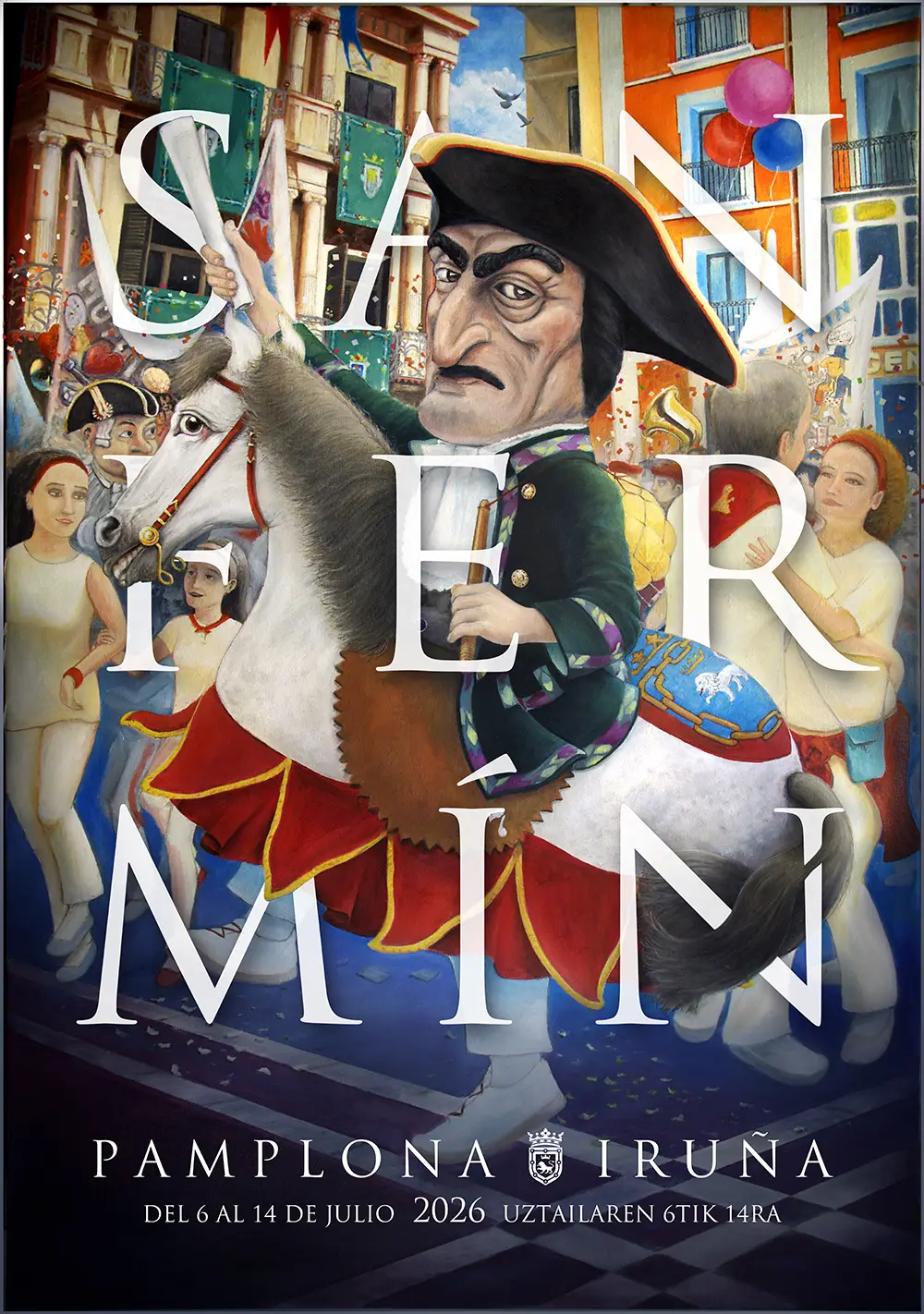 - Caravinagre vuelve a hacerse protagonista de la fiesta, esta vez a lomos de un zaldiko –no sabemos si con el beneplácito de su tradicional jinete o usurpando arteramente su puesto–. De esta manera, el icónico Kiliki destaca entre el bullicio de una plaza del Ayuntamiento en plena jarana, a la vez que sobresale en medio del juego tipográfico que anuncia San Fermín. La vibrante paleta de colores al óleo de la composición refleja la luminosidad de un festejo que invita, como dice el título del cartel, a Venir, ver… ¡Vivir!