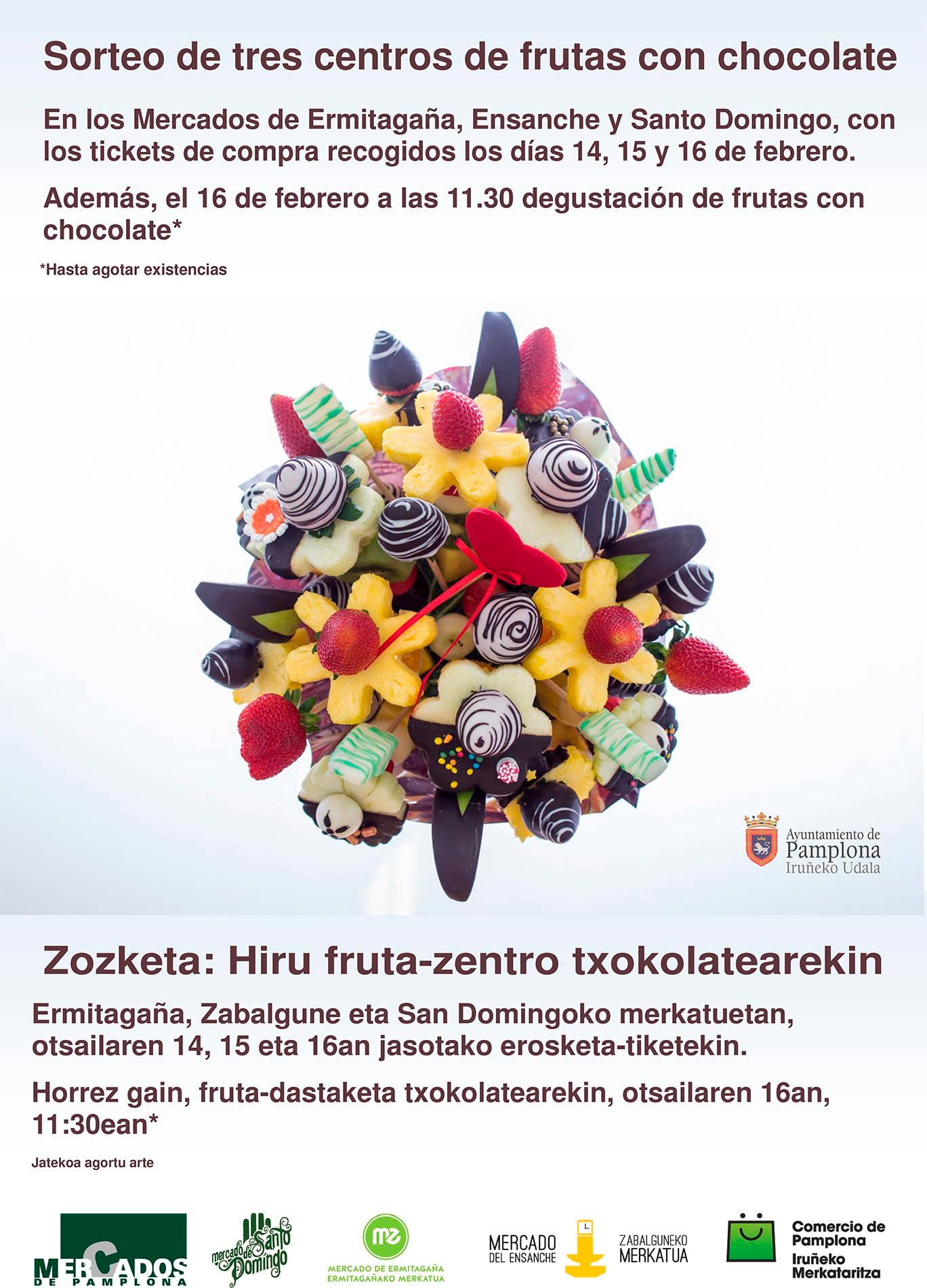Los Mercados municipales de Ermitagaña, Ensanche y Santo Domingo van a sortear centros de frutas de chocolate entre su clientela. Podrán participar aquellas personas que realicen compras en cualquiera de los tres mercados, sin necesidad de gasto mínimo. Los tiques se depositarán en los puestos de los mercados en los que se realicen las compras durante el jueves 14 de febrero, el viernes día 16 y el sábado 16. Se sorteará un centro en cada mercado.