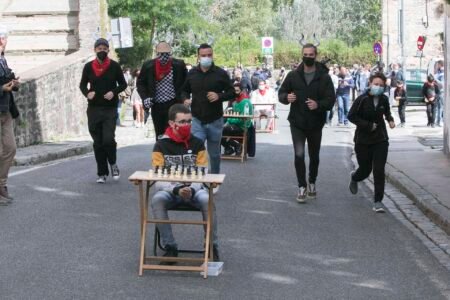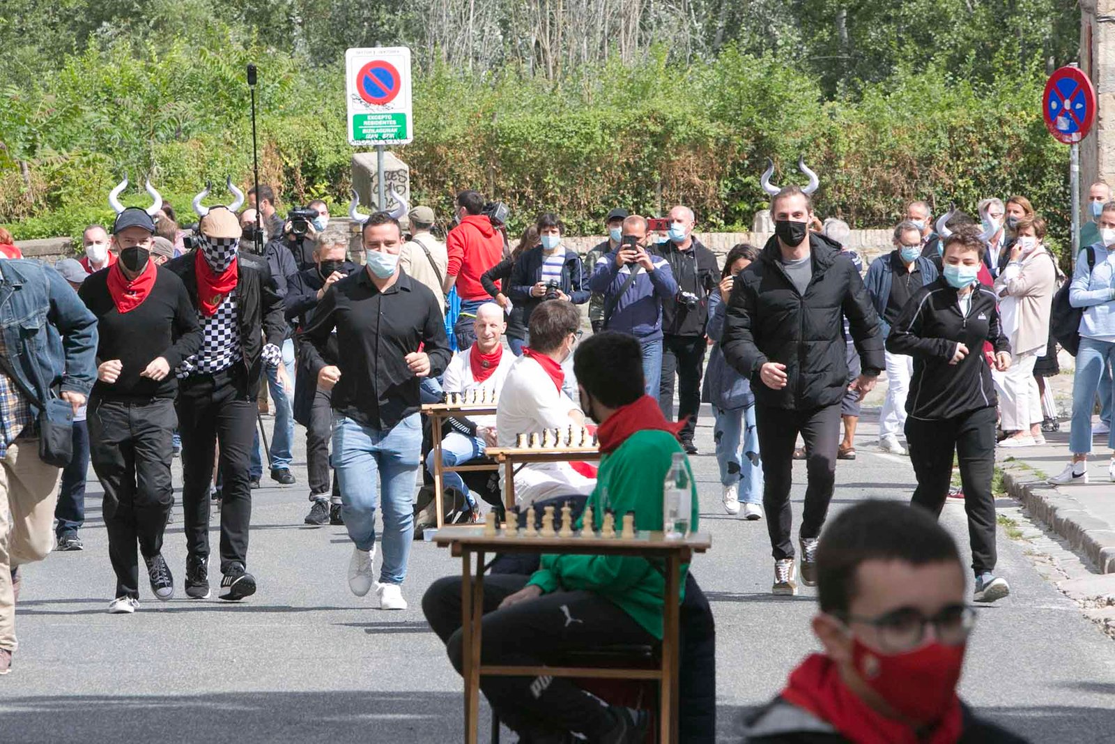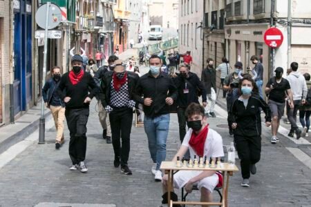 Pamplona celebra este 14 de julio un particular ‘Encierro del ajedrez’ en el que se están jugando simultáneamente 80 partidas entre los corrales de la cuesta de Santo Domingo y el centro de la Plaza de Toros. El lugar de los toros está siendo ocupado por 6 jugadores de ajedrez nacionales e internacionales de alto nivel y los corredores se encuentran representados por 80 jugadores ubicados en otras tantas mesas repartidas a lo largo de los 848 metros de la carrera.