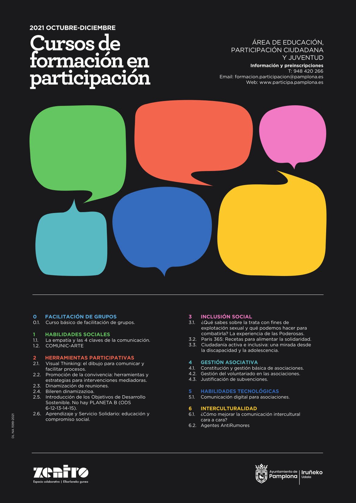Los primeros cursos comienzan ya el 1 de octubre, aunque habrá formación durante todo el trimestre hasta diciembre. Esos cursos se agrupan en siete ámbitos: facilitación de grupos; habilidades sociales; herramientas participativas; inclusión social; gestión asociativa; habilidades tecnológicas; e interculturalidad. Precisamente, los dos primeros cursos en comenzar son el de facilitación de grupos, que tiene carácter anual, y uno sobre cómo mejorar de la comunicación intercultural cara a cara. Toda la información de esta oferta formativa se puede consultar a través del correo electrónico formación.participacion@pamplona.es o vía telefónica en el 948 420 266.