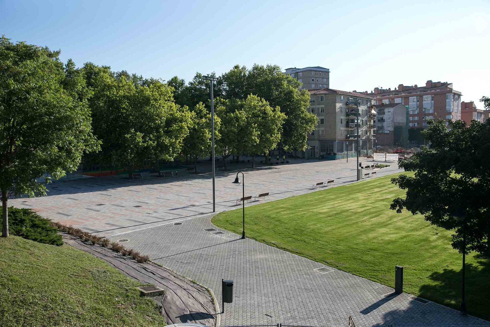 La gran plaza abierta integra una zona de parkour, dos áreas de juegos infantiles, un área multideporte y un gimnasio al aire libre. El diseño se ha basado en un sistema de franjas longitudinales con tramas alternas y diferentes colores y tamaños de pavimento y de zonas verdes, para aislar funcionalmente, que no visualmente, los diferentes usos.