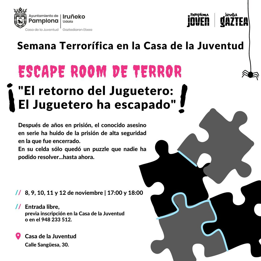 Como oferta continuada todos los días se propondrán dos sesiones del escape room de terror ‘El retorno del Juguetero: El Juguetero ha escapado’, una propuesta de la Asociación L&T que admitirá grupos de hasta 6 participantes. Las sesiones tendrán lugar a las 17 y a las 18 horas, con una duración de alrededor de 45 minutos. Después de años en prisión, el conocido asesino en serie ha huido de la prisión de alta seguridad en la que fue encerrado. En su celda sólo quedó un puzle que nadie ha podido resolver…hasta ahora. La actividad es gratuita, pero requiere inscripción previa en la Casa de la Juventud de manera presencial o llamando por teléfono al 948 23 35 12.