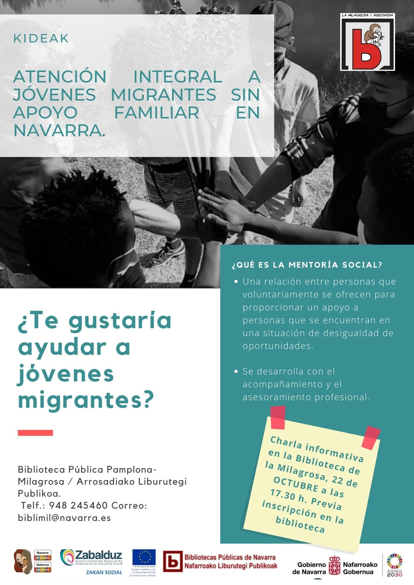La red de bibliotecas públicas apuesta por el voluntariado y en las próximas semanas las de Milagrosa, Pamplona-Yamaguchi y Txantrea van a acoger sesiones informativas del programa ‘Kideak/Compañeros’. Esta propuesta experimental parte de Gobierno de Navarra y busca implicar a personas adultas en la atención integral a jóvenes migrantes de 18 a 23 años que viven en Navarra sin apoyo familiar en Navarra Es un programa de mentoría social y acompañamiento que busca generar espacios de encuentro entre personas mentoras y mentoradas para apoyarles en sus procesos de autonomía e inclusión social.