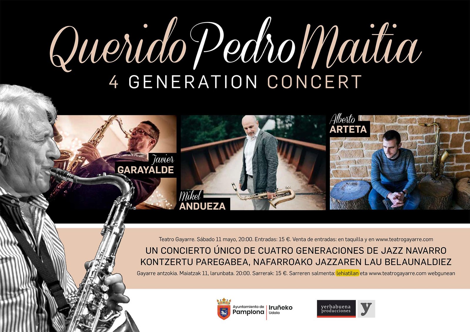 El evento está organizado por el Ayuntamiento de Pamplona y Yerbabuena Producciones. Se trata de un concierto único de homenaje a Iturralde, leyenda viva del jazz con un gran legado tanto en Navarra, donde creó escuela, como fuera de las fronteras, ya que junto a Tete Montoliú es el jazzman más laureado dentro y fuera de España. En el Teatro Gayarre realizará junto a Garayalde, Andueza y Arteta, un recorrido por el jazz de los siglos XX y XXI. Les acompañarán en el escenario Mariano Díaz al piano, Richie Ferrer al contrabajo y Dani García en la batería.