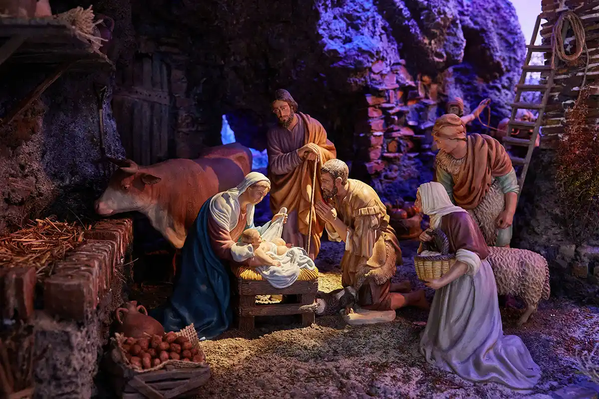 El belén cuenta con una veintena de figuras humanas y de animales en barro cocido pintado, de diferentes tamaños para respetar la perspectiva. Completar este cuadro escénico, especialmente la parte arquitectónica, ha llevado a nueve personas a trabajar durante un año. Los materiales son poliestireno extruido y espuma de poliuretano y masillas pintado todo ello con pigmentos en polvo. El agua del cauce del riachuelo está realizada en resina epoxi. El espacio donde se dispone el diorama tiene 6,67 metros de ancho y 1,17 de alto, dentro de una caja escénica que fue realizada en 2017 por el alumnado de carpintería del Centro de Formación para el Empleo de Landaben.