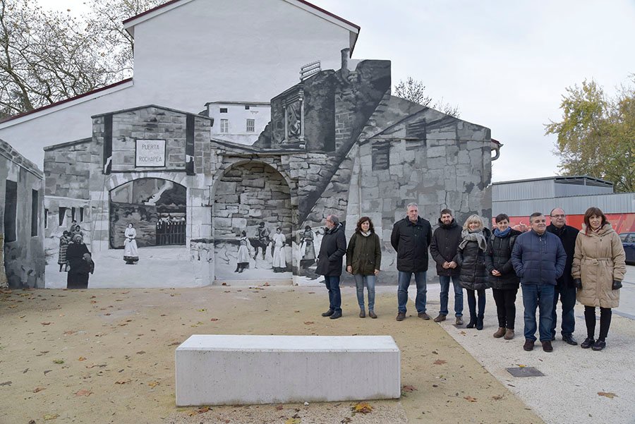Un mural, basado en una foto de 1902 de la antigua puerta de la Rochapea, da la bienvenida a todas las personas que acceden al Casco Antiguo por el puente de Curtidores