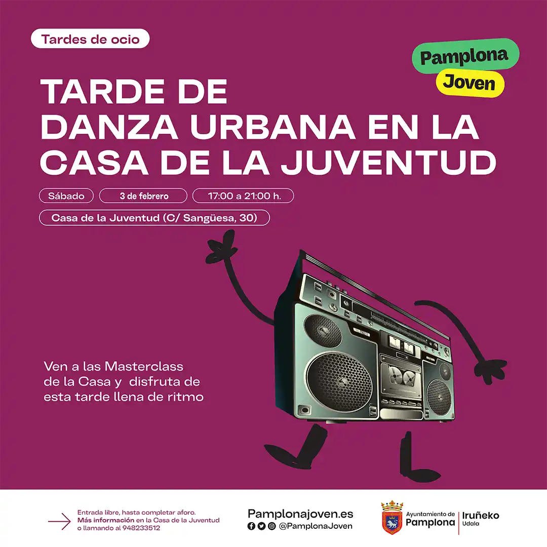 El sábado, 3 de febrero, de 17 a 21 horas, la Casa de la Juventud ofrecerá una Tarde de Ocio de la mano de profesionales de la danza urbana con nueve masterclasses de diferentes estilos. Será un buen momento de aprender nociones básicas de estilos como Hip Hop, Trap, Dancehell o Reggaetón y comprobar si son opciones de ocio interesante.