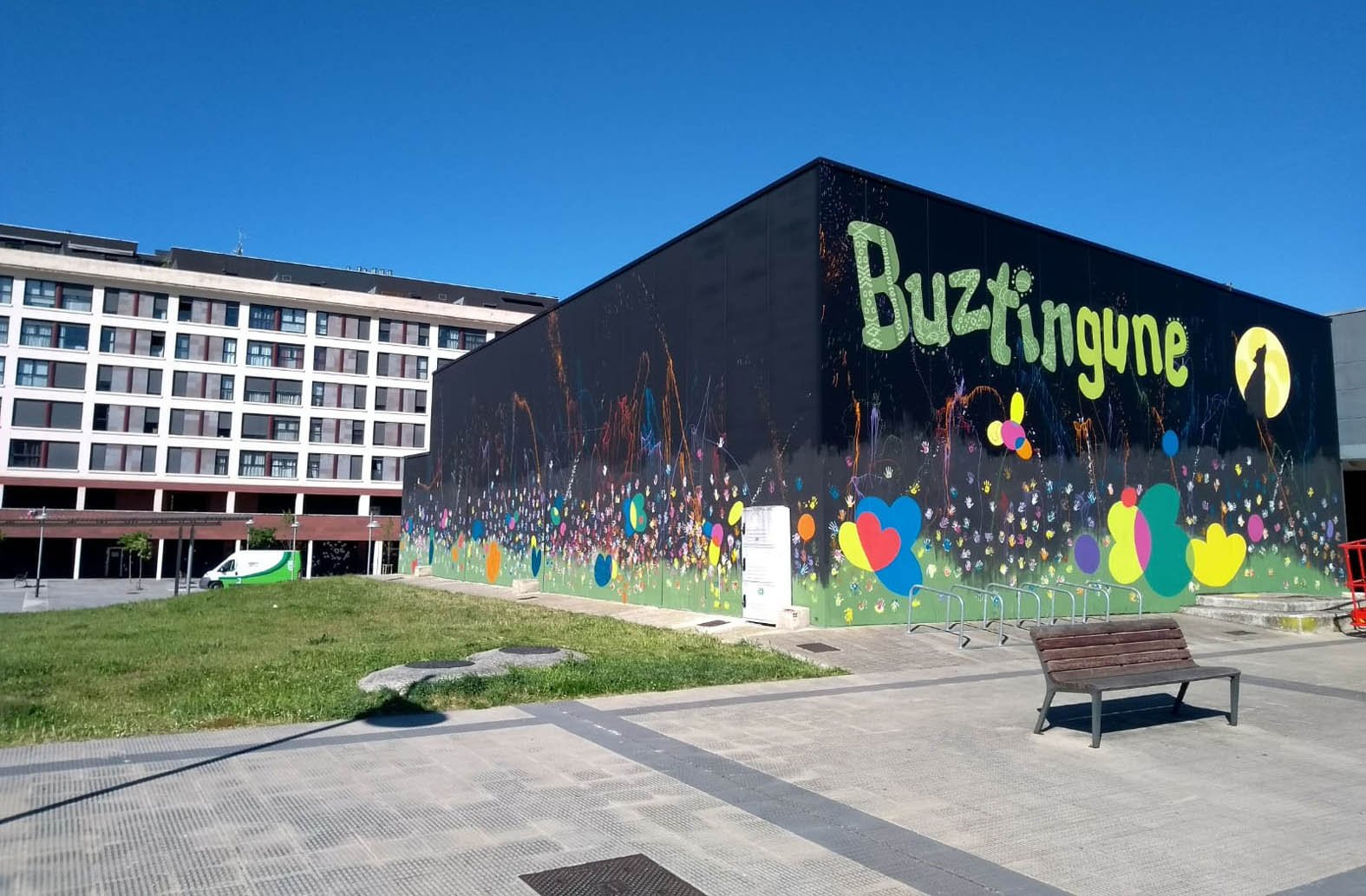 Este pasado fin de semana se inauguró en Buztintxuri, coincidiendo con el Día del Barrio, el mural realizado en la fachada del centro comunitario. El mural plasma el lobo del escudo del barrio como símbolo del empoderamiento de la comunidad y su tejido social, además de motivos romaníes, musulmanes, aztecas, etc. en las letras «Buztingune» para representar la diversidad de su población. En la creación del mural participó el alumnado de 2º a 4º de Primaria del C.P. Buztintxuri.